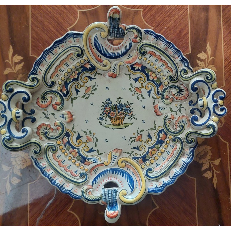 Le décor rocaille, avec ses courbes et ornements délicats, encadre de manière gracieuse le panier fleuri, ajoutant une touche de sophistication à l'ensemble. La palette polychrome apporte une richesse de couleurs vives, chaque nuance accentuant la beauté des motifs floraux.