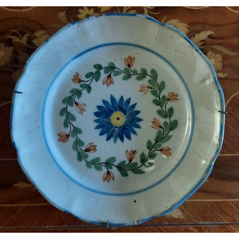 Cette pièce exceptionnelle de faïence de Nevers, réalisée à l'époque néo-classique à la fin du XVIIIe siècle et au début du XIXe siècle, présente un motif central captivant : une fleur délicate avec un pistil jaune, entourée d'une couronne artistiquement composée de fleurs rouges et de feuilles vertes. Ce tableau floral est encadré par des liserés en bleu tant sur le bord de l'assiette que sur le bord du marli.