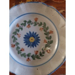 Cette pièce exceptionnelle de faïence de Nevers, réalisée à l'époque néo-classique à la fin du XVIIIe siècle et au début du XIXe siècle, présente un motif central captivant : une fleur délicate avec un pistil jaune, entourée d'une couronne artistiquement composée de fleurs rouges et de feuilles vertes. Ce tableau floral est encadré par des liserés en bleu tant sur le bord de l'assiette que sur le bord du marli.